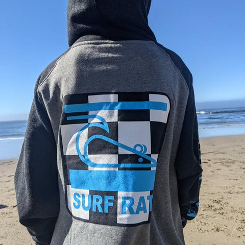 Men's checker logo raglan pullover fleece hoodie, in gunmetal heather with charcoal sleeves and hood.  Checker logo on back in black, white, and blue and front pocket logo. Surf Rats logo down sleeve in blue.