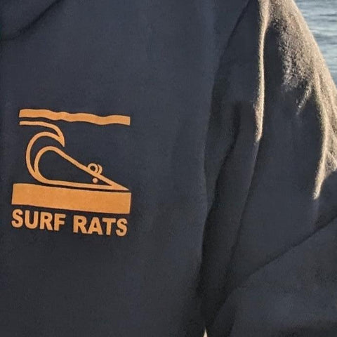This cozy unisex hoodie comes in "sunset", a super soft blackish grey hoodie featuring a colorful scenic sunset at Its beach in Santa Cruz on the back with the Santa Cruz logo in white and a pocket logo on the front in coral. It is also available in "Kelp forest", a super soft teal hoodie with a beautiful sunstreaked kelp forest on the back and the Surf Rats logo in white, and a pocket logo on the front in aquamarine. Available in adult sizes S-2XL.